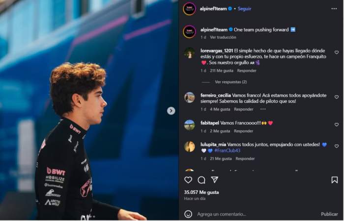 A días del Gran Premio de Hungría, la escudería Alpine compartió una publicación en Instagram con una imagen del piloto argentino Franco Colapinto, de 22 años. Bajo el mensaje “Un equipo empujando hacia adelante”, la escudería reflejó el espíritu con el que enfrentan la competencia en el circuito de Hungaroring.