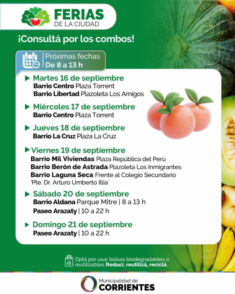 Entre el martes 16 y el domingo 21 de septiembre, las Ferias de la Ciudad, organizadas por la Municipalidad de Corrientes, volverán a recorrer distintos barrios y espacios públicos con una amplia oferta de productos a precios accesibles.