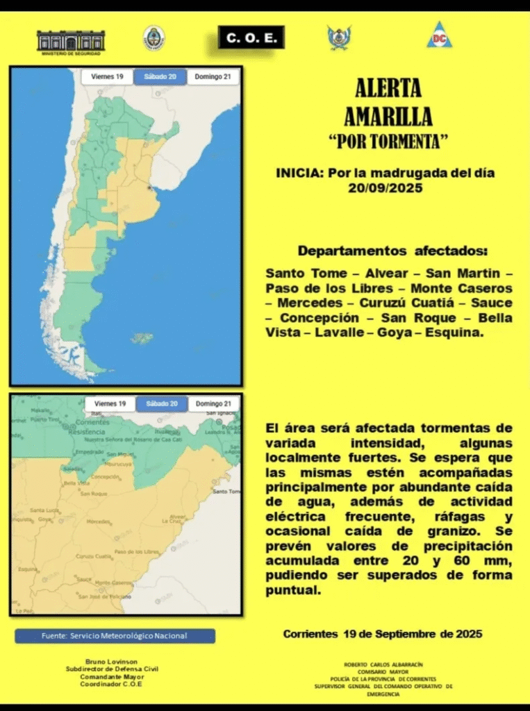 El Comando Operativo de Emergencias (COE) de Corrientes emitió una alerta amarilla por tormentas, con inicio previsto para la madrugada de este sábado 20.