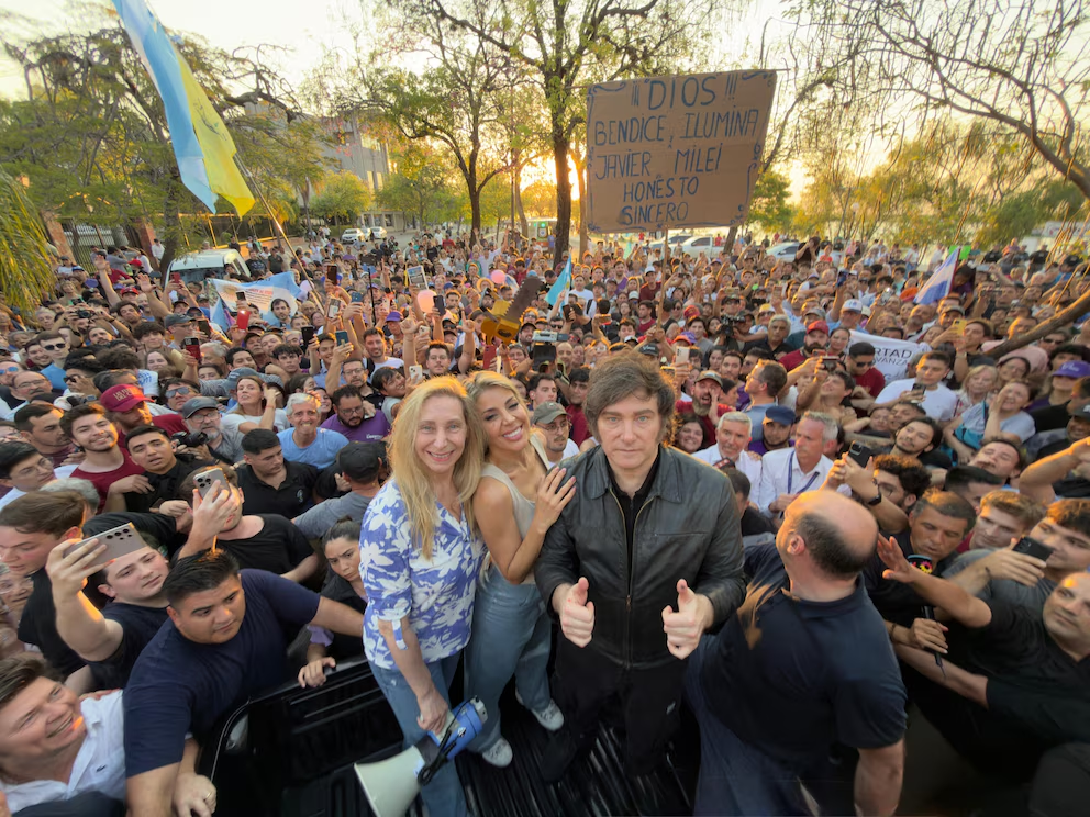 Cerca de las 12, el presidente Milei llegó a la esquina de la plaza Belgrano, en el cruce de las calles French y Paraguay,en el medio de un fuerte operativo de seguridad coordinado entre las fuerzas federales y la policía local. Inicialmente, se apeó y comenzó a saludar a la multitud, pero luego se colocó en la caja trasera de una de las camionetas que integraba la caravana y allí recorrió un tramo del camino acompañado por su hermana Karina, quien llevaba en sus manos un peluche de un león que le arrojaron desde la calle.