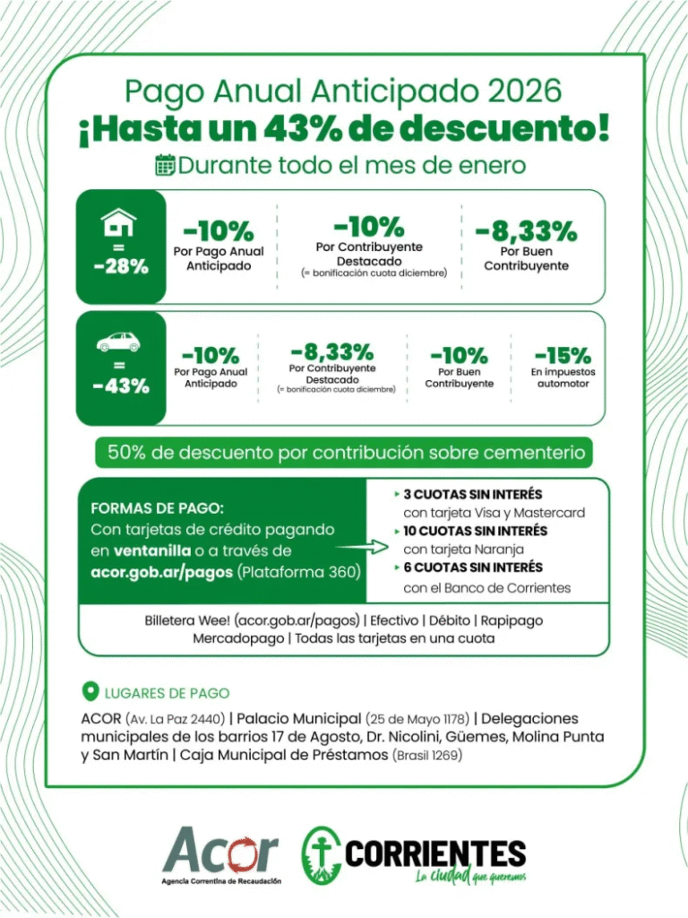 Desde la Municipalidad de Corrientes se comunica que durante enero estarán disponibles las liquidaciones para que los contribuyentes puedan adherirse al Pago Anual Anticipado 2026, que contempla importantes beneficios y descuentos en materia de impuestos, tasas, servicios y contribuciones.