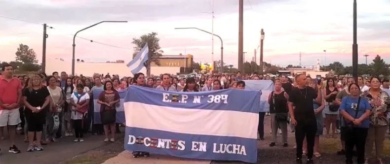 La convocatoria se realizó en el arco de acceso a la ciudad y se sumaron numerosos docentes de los distintos niveles, jubilados y referentes comunitarios.