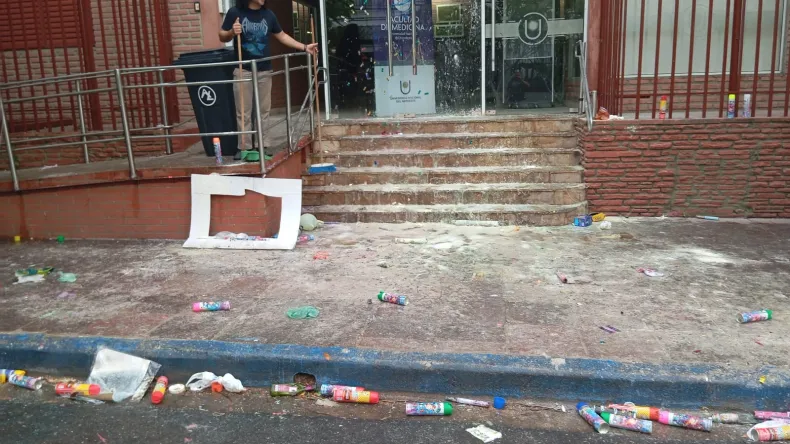 Los frentistas que viven en inmediaciones de la casa de altos estudios sufren cada semana de mesas en las que egresan los nuevos médicos, ya que la suciedad que provocan con los festejos los amigos y familiares de los egresados no solo ensucian, sino que además no limpian lo que dejan.