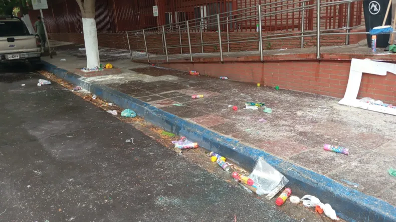 Lo peor, los que ensucian hacen el enchastre y luego se marchan, dejando el desastre para que lo limpien los celadores de la faculta. En una de las fotografías se puede ver como dejaron abandonado incluso el marco para las clásicas fotografías de los egresados, que una vez terminado el festejo perdió su utilidad, pero en lugar de tirarlo en un basurero, el novel médico decidió dejarlo en la vereda.